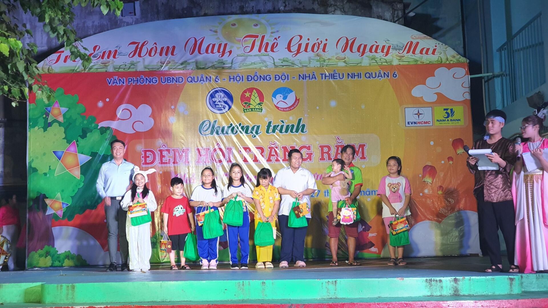 Trong đêm hội, chị Hằng và chú Cuội đã khéo léo dẫn dắt các em thiếu nhi, phụ huynh hòa mình vào ngày Tết Trung thu lung linh sắc màu với các trò chơi của tuổi thơ, các tiết mục văn nghệ đón trăng và biểu diễn lân sư rồng, đã tạo bầu không khí vui tươi, đầm ấm, bởi những tiếng cười vui, những giọng hát trong trẻo và những điệu múa đặc sắc. Bên cạnh đó, Nhà Thiếu nhi Quận 6 cũng đã phối hợp với Văn phòng UBND quận 6, Hội đồng Đội quận 6 và công ty Điện lực thành phố, ngân hàng Nam Á trao tặng gần 200 phần quà cho các em đang học tập, sinh hoạt tại đơn vị và các em thiếu nhi bị ảnh hưởng bởi dịch Covid-19 trên địa bàn quận 6, góp phần thực hiện công tác bảo vệ, chăm sóc và giáo dục trẻ em.