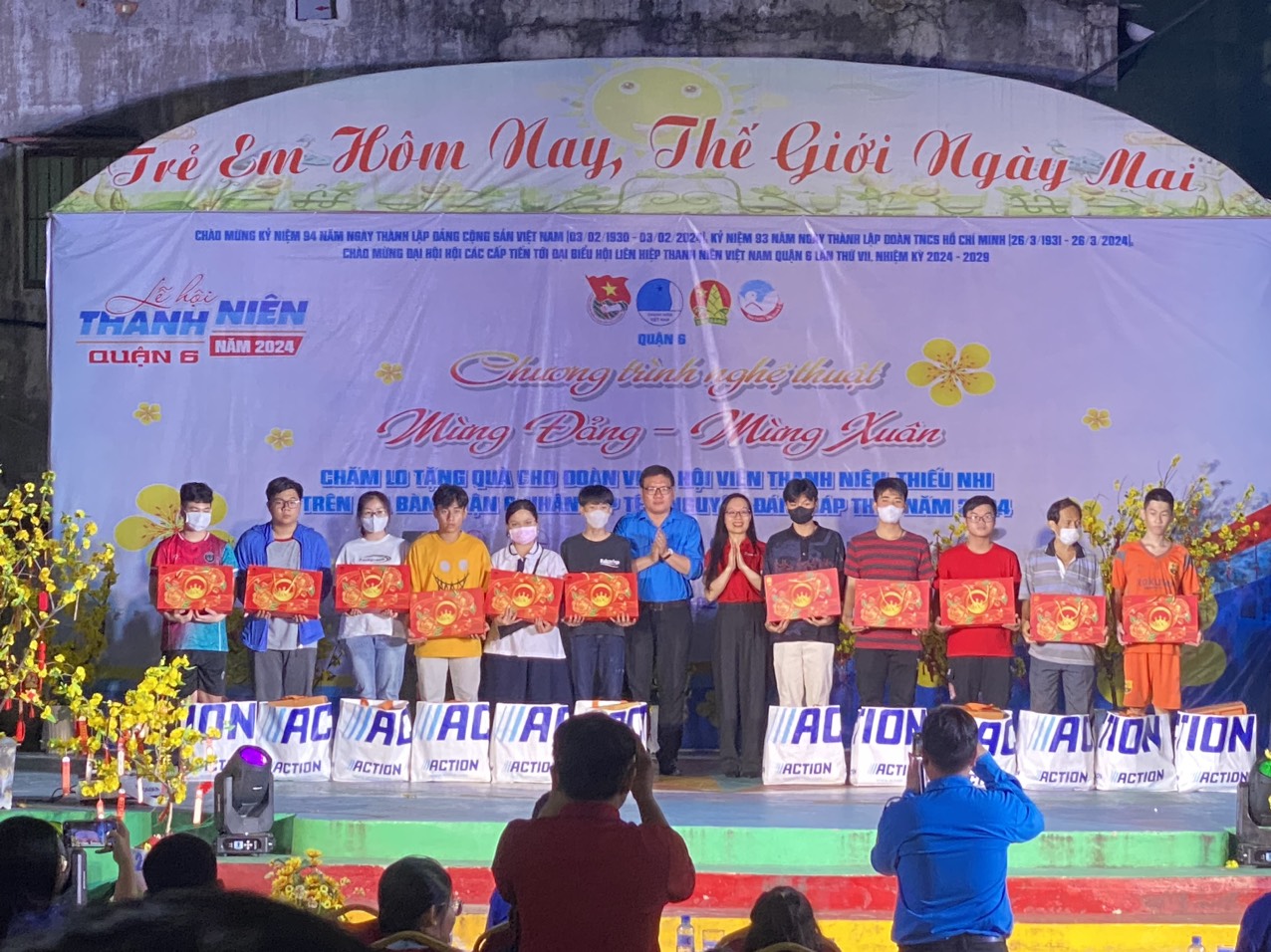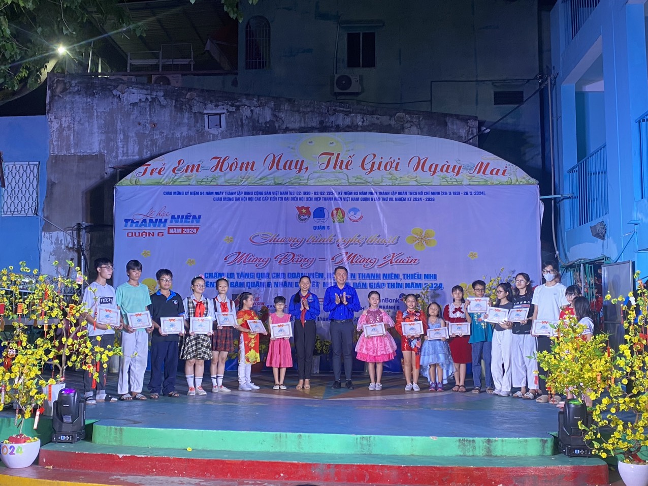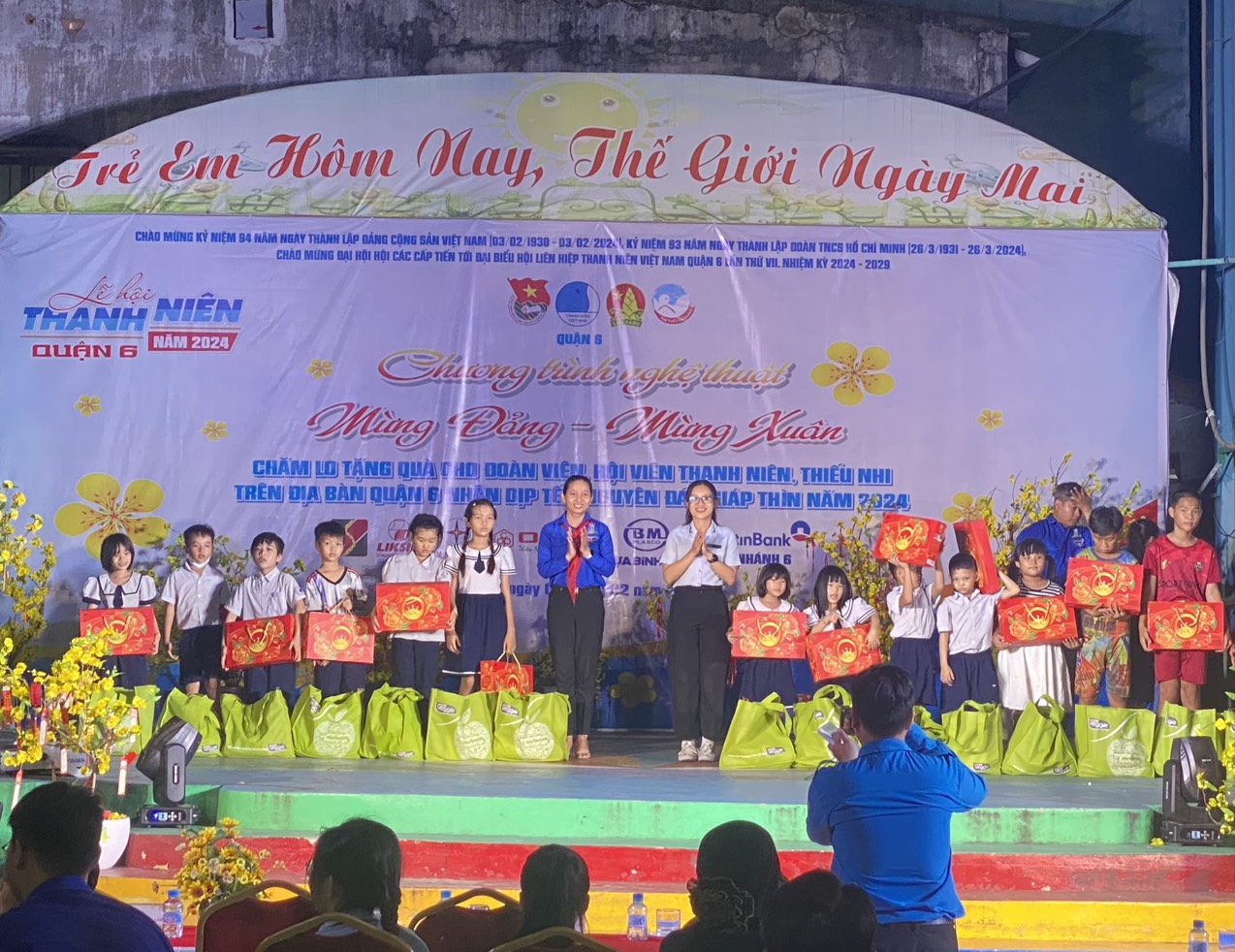 Ngày 02/02/2024, tại Nhà Thiếu nhi Quận 6 đã diễn ra chuỗi hoạt động Mừng Đảng – Mừng Xuân Giáp Thìn năm 2024. Đến tham dự chương trình có Đ/c Lê Thị Thanh Hương – Phó Chủ tịch UBMTTQVN Quận 6; Đ/c Nguyễn Thị Thanh Vân – Trưởng phòng Kinh tế Quận; Đ/c Huỳnh Minh Phúc Hậu – Bí thư Quận Đoàn, Giám đốc Nhà Thiếu nhi Quận 6…; Cùng các anh chị khách mời là đại diện Chi đoàn công ty Điện lực Bình Phú, đại diện Ngân hàng AgriBank – Chi nhánh Bắc TP.HCM, đại diện Ngân hàng VietinBank – Chi nhánh 6, đại diện CTCP American Learning Lab…; Và đặc biệt là sự có mặt của đông đảo quý phụ huynh, các anh chị đoàn viên thanh niên, phụ trách thiếu nhi và hơn 300 em thiếu nhi đến tham dự chương trình.